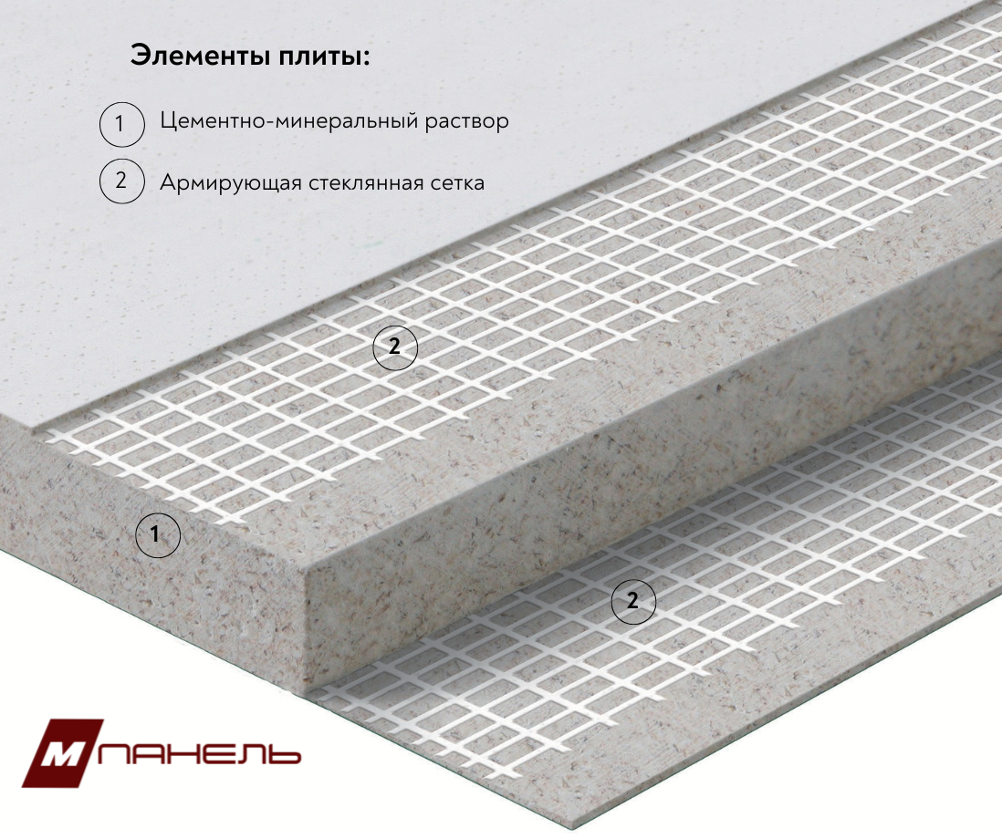 Цементно-минеральная плита МПанель представляет собой высококачественный строительный материал, изготовленный на основе портландцемента с добавлением лёгких минеральных наполнителей. Плита с двух сторон армирована стекловолоконной сеткой, что обеспечивает ее прочность и долговечность.